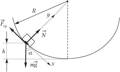 где Fтр.ск = µN — модуль силы трения скольжения; N = mg sin α — величина силы нормальной реакции поверхности полусферы; µ — коэффициент трения.